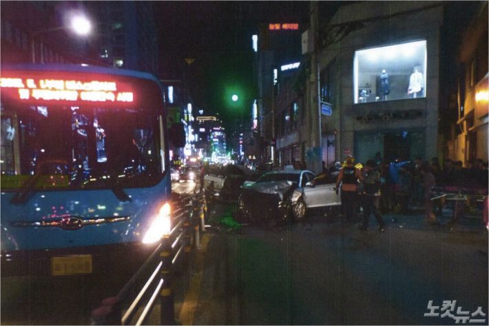 6일 오후 10시 18분쯤, 부산 동래구 명륜동 이면도로를 달리던 택시가 또다른 택시와 시내버스를 잇따라 들이받는 사고가 발생했다. (부산 CBS)