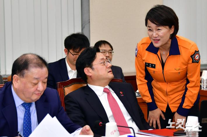 9일 국회에서 열린 행정안전위원회 전체회의 강원도 지역 산불 피해 현황 및 복구 지원 관련 현안 보고에 더불어민주당 이재정 의원이 소방복을 입고 참석하고 있다.