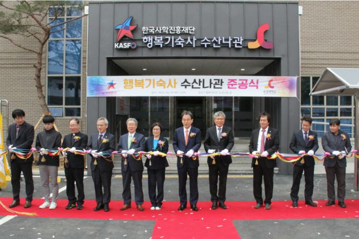 이날 준공된 행복기숙사는 지난해 3월 공사에 들어가 지상 7층, 연면적 7,025m² 규모로, 총 411명의 학생을 수용할 수 있다.