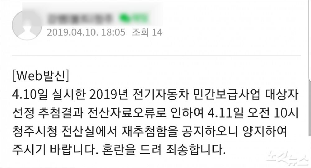 청주시 전기차 선정 전산 실수로 재추첨