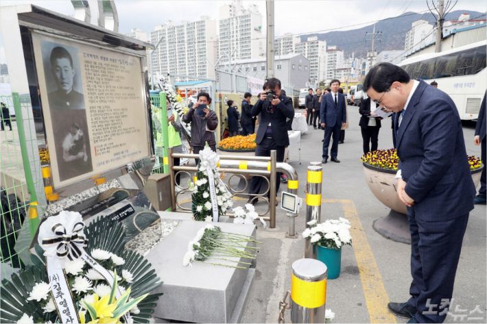 허성무 창원시장이 김주열 열사 시신인양지에서 헌화와 묵념을 하고 있다. (사진=창원시 제공)