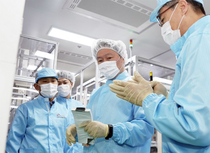 최태원 SK 회장이 19일 충남 서산 배터리 공장에서 현장 직원들과 함께 설비를 둘러보고 있다. (사진=연합뉴스)