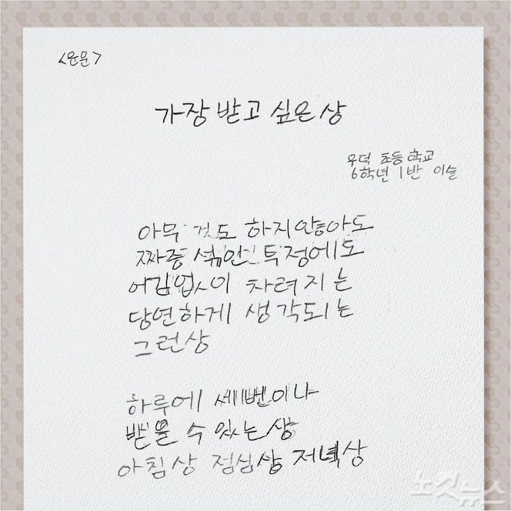 2016년 부안 우덕초등학교 6학년 이슬 양이 쓴 시 '가장받고 싶은 상' (자료+전북교육청)