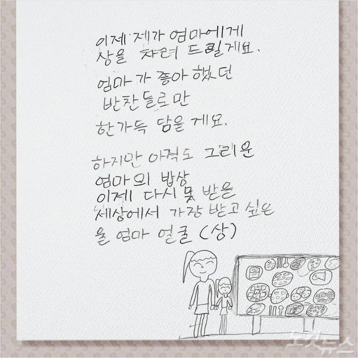 '아직도 그리운 엄마의 밥상/이제 다시 못 받을 세상에서 가장 받고 싶은 울 엄마 얼굴'이라고 여운을 남긴 것.