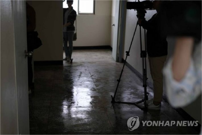 창원 살인 현장 (창원=연합뉴스) 김동민 기자 = 24일 오전 경남 창원시 마산합포구 한 아파트 복도에서 미성년자 A군이 위층에 거주하는 할머니를 흉기로 숨지게 한 현장을 취재진이 살펴보고 있다.