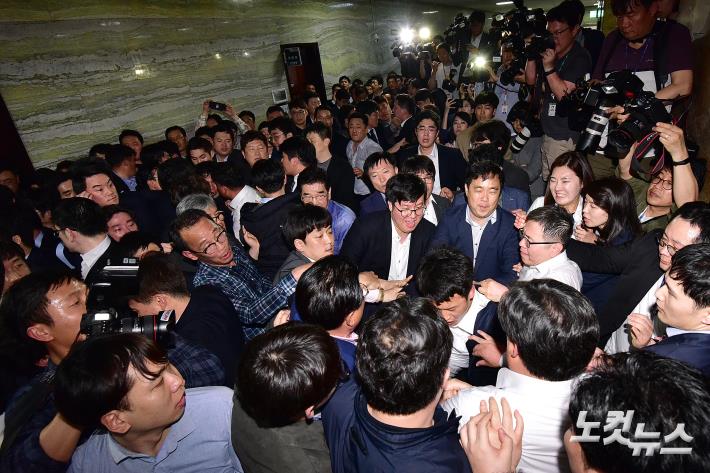 문희상 국회의장이 패스트트랙 법안접수를 위한 경호권을 발동한 가운데 25일 저녁 국회 의안과 앞에서 자유한국당 의원 및 당직자들이 법안접수를 시도하는 더불어민주당 의원을 비롯한 경호처 직원들과 충돌하고 있다.
