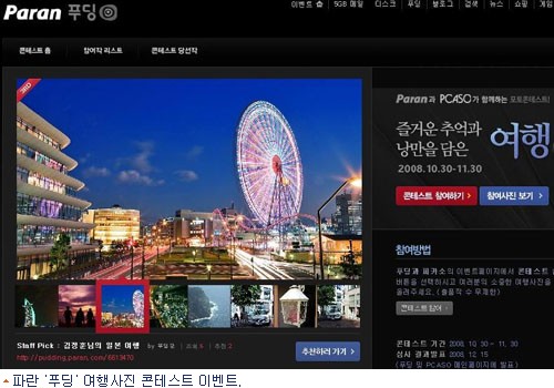콘테스트 참가 희망자는 11월 31일까지 파란 ''푸딩(pudding.paran.com)'' 또는 피카소 사이트(www.pcaso.kr)의 이벤트 페이지를 통해, 여행과 관련된 사진을 올려 응모하면 된다.