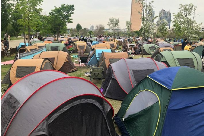 이날 오후 여의도 공원 계절광장 일대는 텐트들로 발 디딜 틈이 없었다. 대다수는 인근 대여소에서 빌린 텐트였다. 지역 주민이 많은 반포나 잠원 공원과 달리 외지에서 오는 방문객이 많다 보니 대여 텐트가 많다는 게 단속반 측의 설명이다.