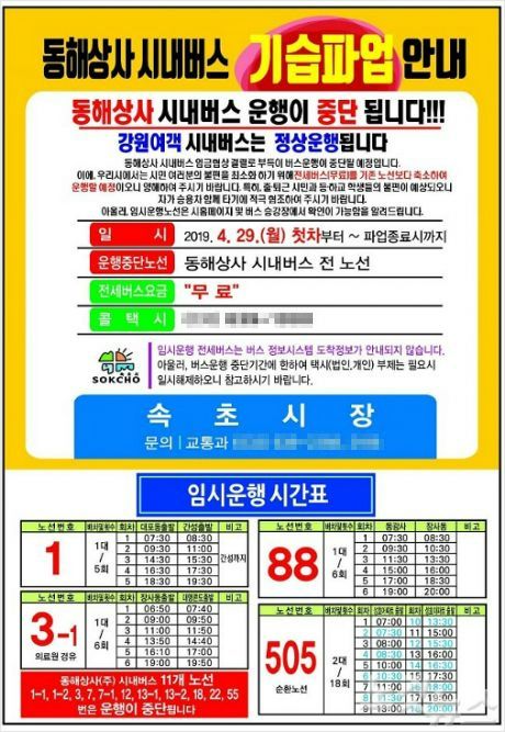 강원 동해안 지역에서 버스를 운행하는 동해상사고속(주) 노조가 29일부터 시내버스를 포함한 모든 버스 운행에 대해 총파업을 실시함에 따라 각 지자체들이 긴급 비상수송 대책 마련에 나섰다.