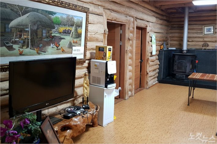 TV와 화목난로가 구비된 거실. 이용객 편의를 위해 와이파이도 갖추고 있다.