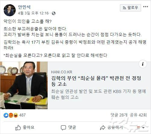 안 의원은 지난 3일 관련 기사를 페이스북에 링크하며 "악인이 의인을 고소를 해? 최소한 부끄러운 줄은 알아야 한다"며 "최순실을 모른다고? 모른다로 읽고 잘 안다로 해석한다"는 게시글을 올렸다.