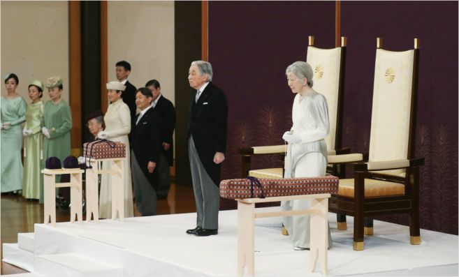 아키히토 일왕이 30일 오후 도쿄 지요다(千代田)구에 있는 고쿄(皇居) 내 영빈관인 '마쓰노마'에서 퇴위 행사를 치르고 있다. 오른쪽은 미치코(美智子) 왕비. (사진=연합뉴스 제공)