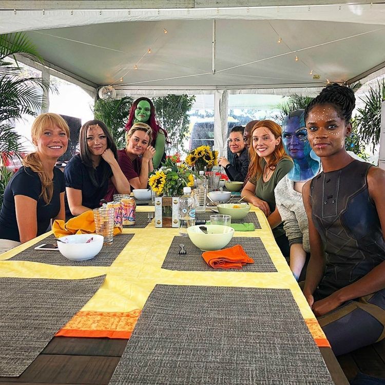 사진에는 '아이언맨' 로버트 다우니 주니어와 '와스프' 에반젤린 릴리, '오코예' 다나이 구리라, '스칼렛 위치' 엘리자베스 올슨, '네뷸라' 카렌 길런, '슈리' 레티티아 라이트, '아이언맨' 토니 스타크의 연인이기도 한 '페퍼 포츠' 기네스 팰트로, '멘티스' 폼 클레멘티프, '캡틴 마블' 브리 라슨, '가모라' 조 샐다나가 함께 모여 있다. 몇몇 배우들은 극 중 인물 분장을 하고 있다.