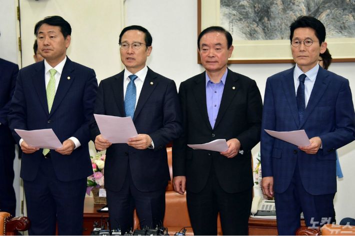 여야 4당 원내대표(좌측부터 바른미래당 김관영, 더불어민주당 홍영표, 민주평화당 장병완, 정의당 윤소하)들이 1일 국회에서 패스트트랙 후속 논의를 위한 회동을 갖고 있다. (사진=윤창원 기자)