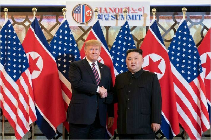 지난 3월 27일 베트남 하노이 소피텔 레전드 메트로폴 호텔에서 악수하는 도널드 트럼프 미국 대통령과 김정은 북한 국무위원장. (사진=백악관 트위터)