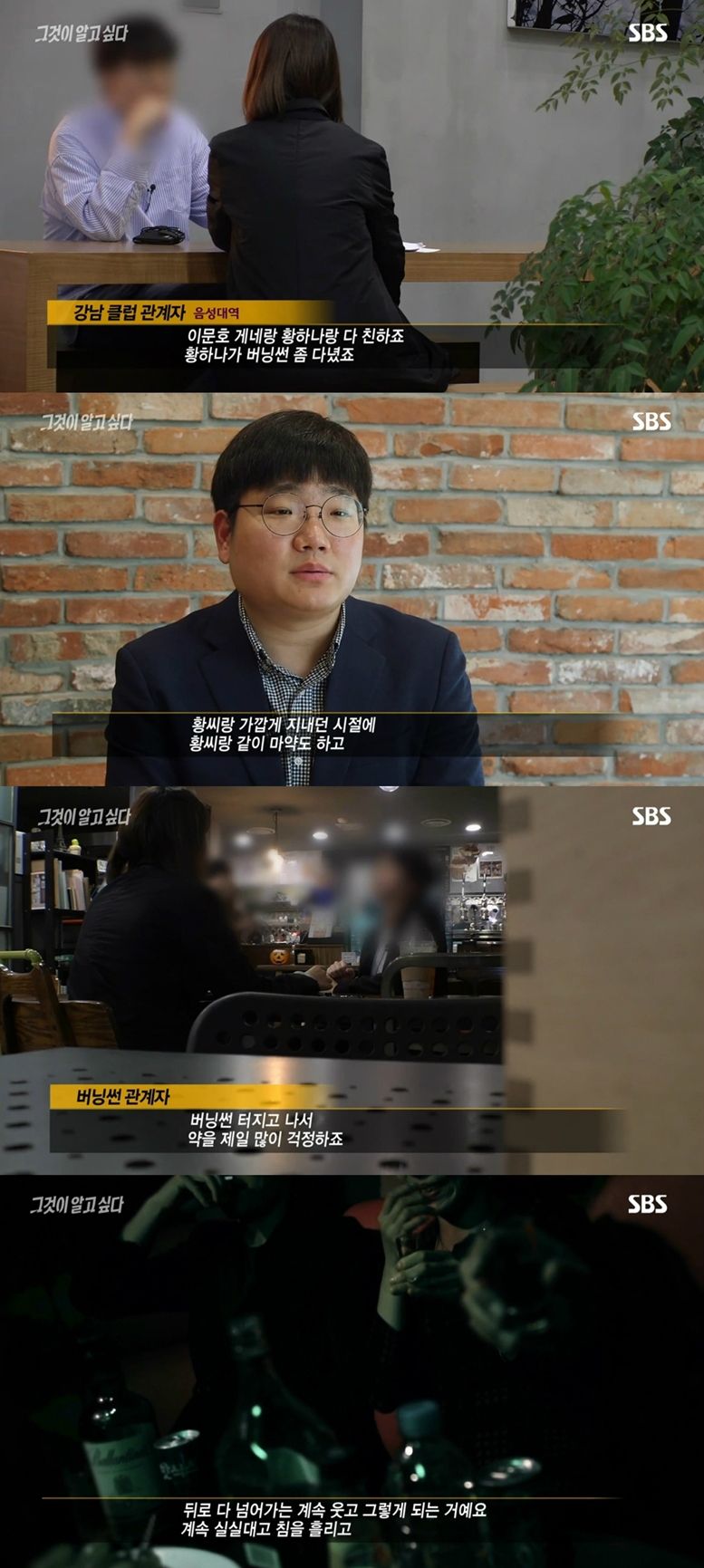 강남 클럽 관계자는 황 씨가 이문호 대표와 친했고 버닝썬에 다녔다고 제보했다. 또한 버닝썬 관계자는 폭행 사건이 보도됐을 때 버닝썬 측은 마약 사실이 드러나는 것을 걱정했을 거라고 말했다. (사진='그것이 알고 싶다' 캡처)