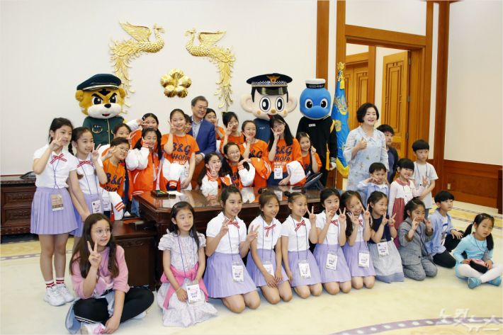 문재인 대통령이 어린이날인 5일 오전 청와대 집무실에서 초청된 어린이들과 기념촬영을 하고 있다. 이날 청와대는 강원도 산불진화 소방관, 군인, 경찰 자녀와 산불 피해 초등학교 학생 및 아동정책 수혜 아동, 독립유공자 후손 등 총 180명의 어린이를 청와대로 초청해 행사를 열었다. (사진=연합뉴스 제공)