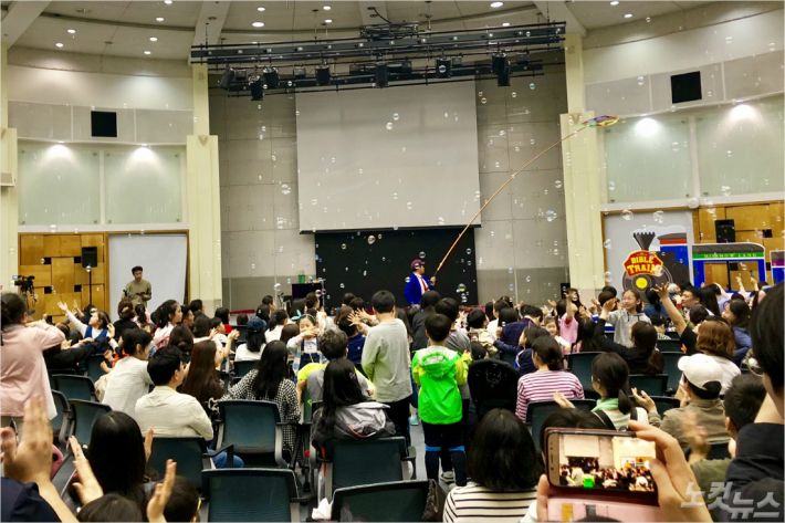 지난 6일 서울 광진구 건국대학교 새천년홀에서 열린 어린이날 축제 '히즈쇼랜드'의 버블아트쇼.