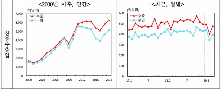 전년동기 대비 수출은 2016년 3분기(-3.9%) 이후 10분기만에 감소를 기록했다. 1분기 수출은 1375억달러로 전년동기(1501억달러) 대비 8.4% 감소했다. 세계교역량 둔화, 반도체·석유류 수출감소, 대중국 수출 부진 등이 원인이라고 한국은행은 설명했다.