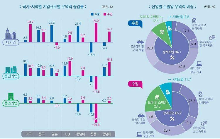 대기업은 수입액도 3284억 달러로 전체의 62.2%를 차지했다. 중견기업은 763억 달러로 14.5%, 종시기업은 1232억 달러로 23.3%였다. 일년전에 비해 대기업은 446억 달러(15.7%p), 중견기업은 65억 달러(9.3%p), 중소기업은 37억 달러(3.1%p) 각각 증가했다.