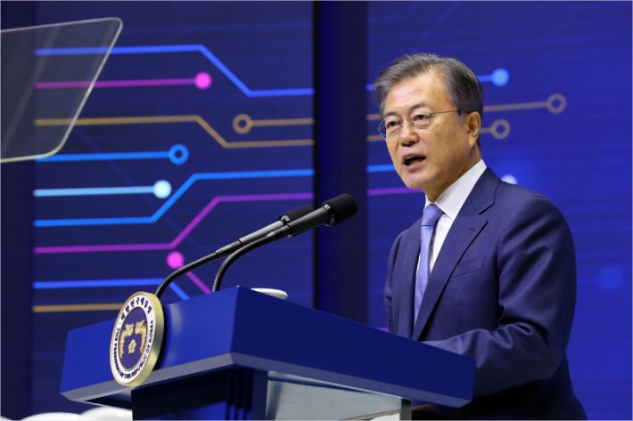 문재인 대통령이 지난달 30일 오후 시스템 반도체 비전 선포식이 열린 삼성전자 화성캠퍼스 부품연구동(DSR)에서 대한민국 반도체 비전을 선포하고 있다. (사진=연합뉴스 제공)