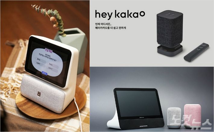 AI스피커 누구네모(왼쪽)‧카카오미니C(오른쪽상단)‧기가지니 테이블TV(사진=SK텔레콤‧카카오‧KT 제공)