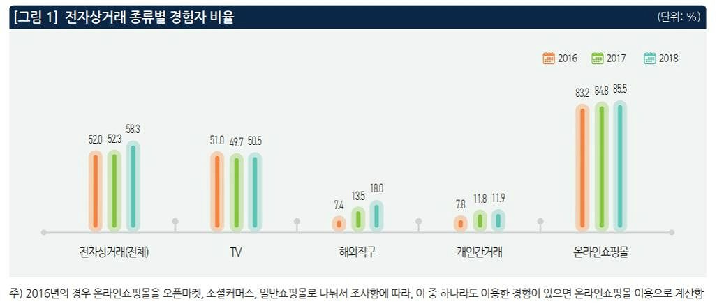지난해 전자상거래 가운데 온라인쇼핑몰 구매 경험자 비율이 85.5%로 가장 높았고, TV 50.5%, 해외직구 18.0%, 개인 간 거래 11.9% 등의 순이다.