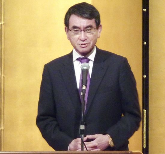 고노 다로 일본 외무상이 11일 삿포로에서 열린 '요미우리 비즈니스 포럼 2019'에서 '향후의 일본외교 방향'이란 주제로 연설하고 있다. (사진=연합뉴스)