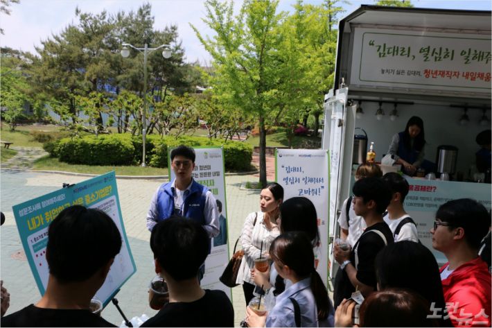지난 10일 중진공 성과보상기획처 직원 15명은 진주 경상대학교내에서 첫 번째 홍보 활동에 나서 500여 명의 청년들에게 희망메시지를 담은 커피를 나눠주면서 청년재직자 내일채움공제에 대한 1:1 현장상담을 실시하고, 공제사업에 대한 궁금증을 해소했다.