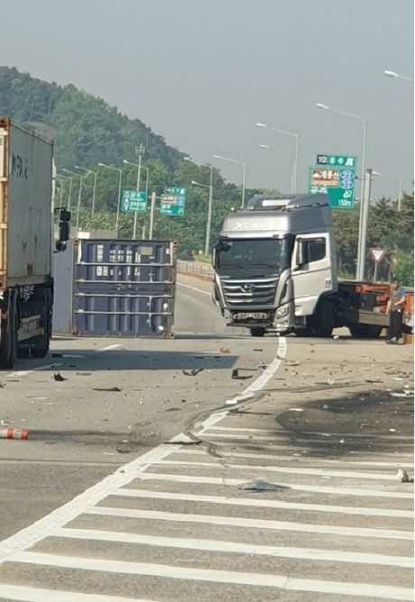 사고로 도로 막은 컨테이너. (사진=독자 제공)