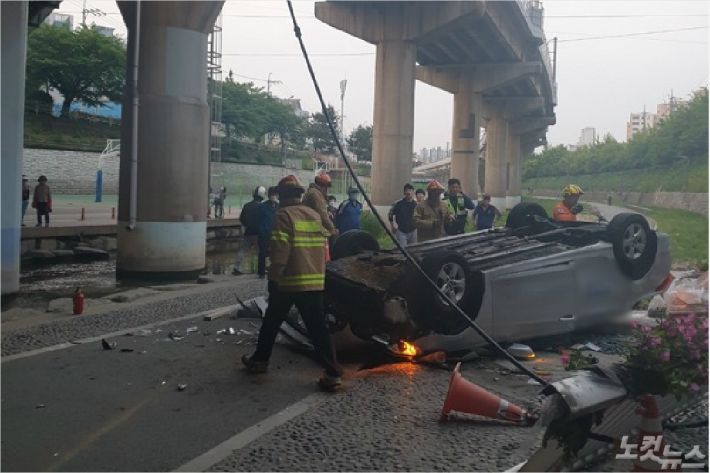 이후 차량은 멈추지 않고 계속 직진해 10m 아래 온천천 바닥으로 추락했다.