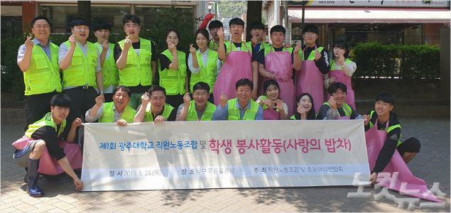 광주대 직원노동조합과 학생들로 구성된 20명의 자원봉사대가 16일 남구 푸른길 광장 일대에서 광주남구자원봉사센터 주관으로 열린 '사랑의 밥차' 봉사활동에 동참했다.