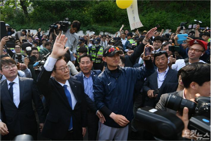 대기하고 있던 지지자들은 이 지사가 걸어 나오자 일제히 환호했다. 이 지사는 덤덤한 표정으로 지지자들에게 손을 흔들며 감사의 인사를 전했다.