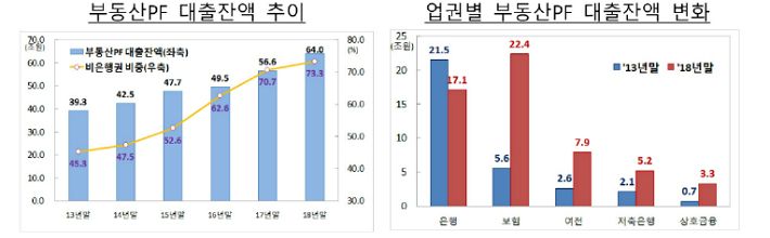 은행권의 부동산PF 대출은 2013년말 21조5000억원에서 지난해말 17조1000억원으로 줄었다. 반면 비은행권에서는 같은 기간 17조8000억원에서 46조9000억원으로 급증했다. 금융위는 이에 따른 금융권 완충력·복원력 저하 여부를 점검해야 한다는 입장이다.