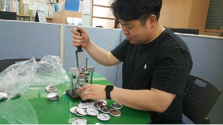 5.18배지를 제작하고 있는 이권형 교사(사진=광주 운남초등학교 제공)
