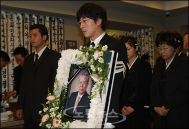 18일 서울 일원동 삼성병원 영안실에서 영화배우 김주혁이 아버지 고 김무생씨의 영정을 들고 빈소를 나서고 있다.
