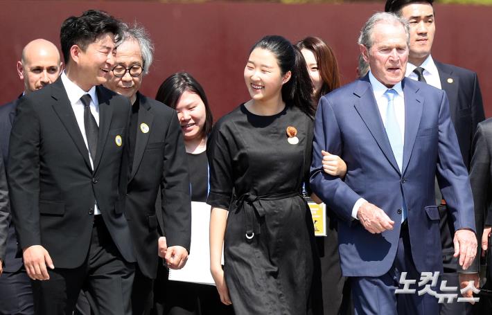 23일 경남 김해 봉하마을에서 열린 故 노무현 대통령 10주기 추도식에서 묘역 참배를 마친 조지 W. 부시 전 미국 대통령이 아들 건호씨와 손녀의 안내를 받으며 이동하고 있다.