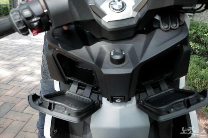 이밖에 핸들 바 밑에 두 개의 수납공간이 있는데 파워 온 상태에서만 열린다. 시트 밑에도 헬멧 등을 넣을 수 있는 대형 수납공간 있다.