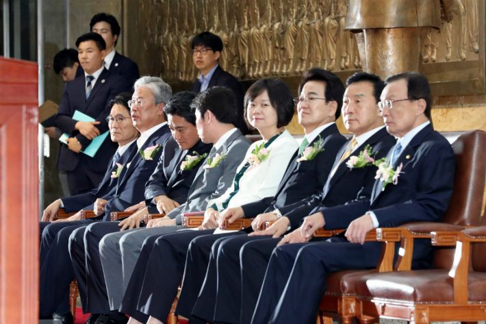 이날 행사에는 이주영, 주승용 국회 부의장과 한국당을 제외한 더불어민주당 이해찬, 바른미래당 손학규,민주평화당 정동영, 정의당 이정미 대표와 이인영, 오신환, 유성엽, 윤소하 각 당 원내대표들이 참석했다.