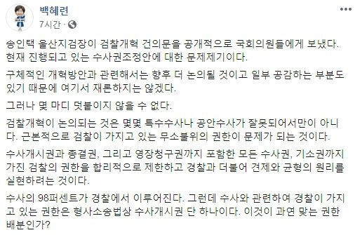국회 사법개혁특별위원회 간사이기도 한 백 의원은 이날 SNS 페이스북에 글을 올려 이같이 말하면서 "글 중에 가장 불편했던 점은 경찰에 대한 불신과 철저한 검찰 우위의 신념" 비판했다.