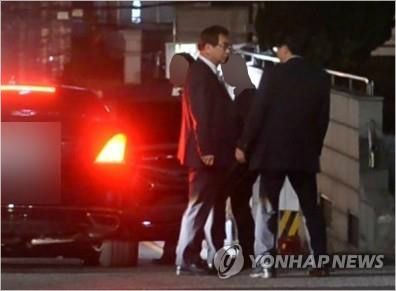 서훈 국정원장(앞줄 왼쪽)과 양정철 민주연구원장(앞줄 오른쪽)이 지난 21일 오후 서울 강남의 한 한정식집에서 회동을 마친 뒤 헤어지기 전 식당 앞에서 대화를 나누고 있다.(사진=연합뉴스 제공)