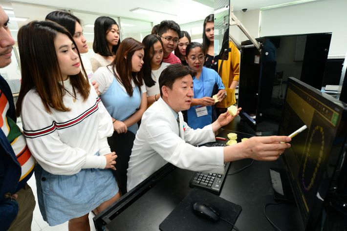 필리핀 리시움 대학의 치과대학 연수단이 대구보건대 박영대 치기공과 교수로부터 '디지털 치과 보철물 제작 기초”에 대해 설명을 듣고 있다.
