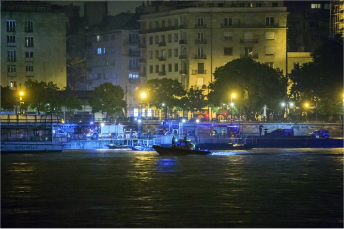 한국인 관광객들이 탑승한 유람선 '허블레아니'(헝가리어로 '인어')가 침몰한 헝가리 부다페스트 다뉴브강에서 30일(현지시간) 구조선이 구조 및 수색 작업을 벌이고 있다.(EPA=연합뉴스)
