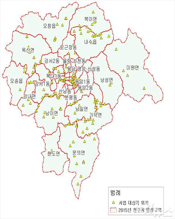 사창동인 충북대학교를 개신동으로 조정하는 등 주민들이 찬성하거나 별다른 의견이 없는 45곳을 시작으로 올해 하반기부터 경계조정을 우선 추진할 방침이다.