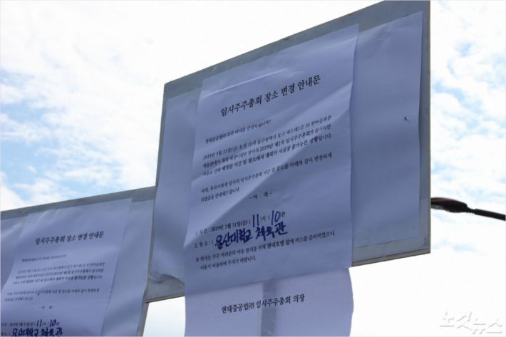 그런데 그때 확성기를 통해 "주주총회 장소가 울산 남구 울산대학교 체육관으로 변경됐다"는 소식이 전해졌다.
