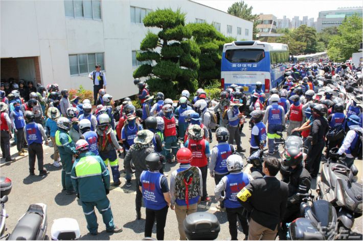 수천명의 현대중공업 노조와 민노총 조합원들은 황급히 울산대로 향했다.