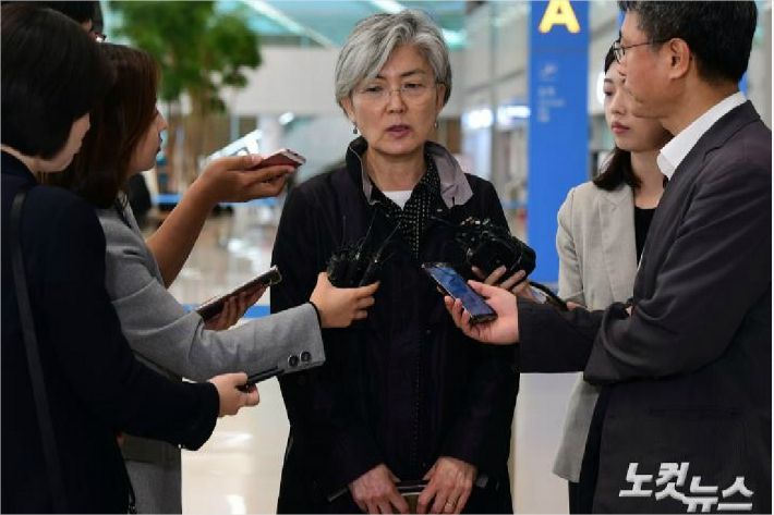 헝가리 유람선 침몰 사고와 관련해 현장을 직접 방문했던 강경화 외교부 장관이 2일 오후 인천공항을 통해 귀국, 취재진의 질문에 답하고 있다. 인천공항=CBS노컷뉴스 황진환 기자