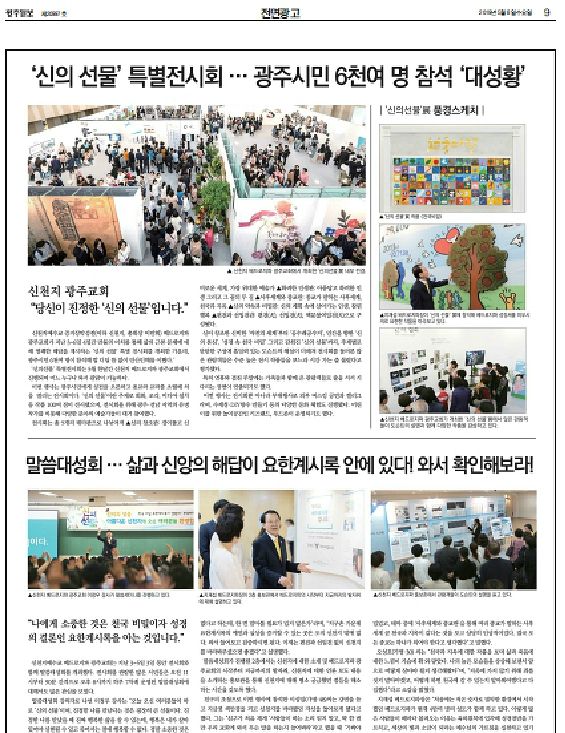 실제 광주일보가 지난 5월 9일과 5월 28일에 실은 신천지 광고는 신문 9면에 실렸다. 기사 형태로 꾸며진 해당 광고들은 각각 '광주시민 1만 명 평화의 사자가 되어'와 '신의 선물 특별전시회 광주시민 6000여 명 참석 대성황'이라는 제목을 달고 있다.