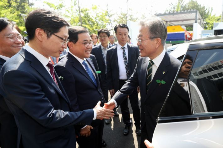 이날 오후 3시쯤 문 대통령과 김 지사는 수소버스를 타고 패키지형 도심 수소충전소에 도착했다.