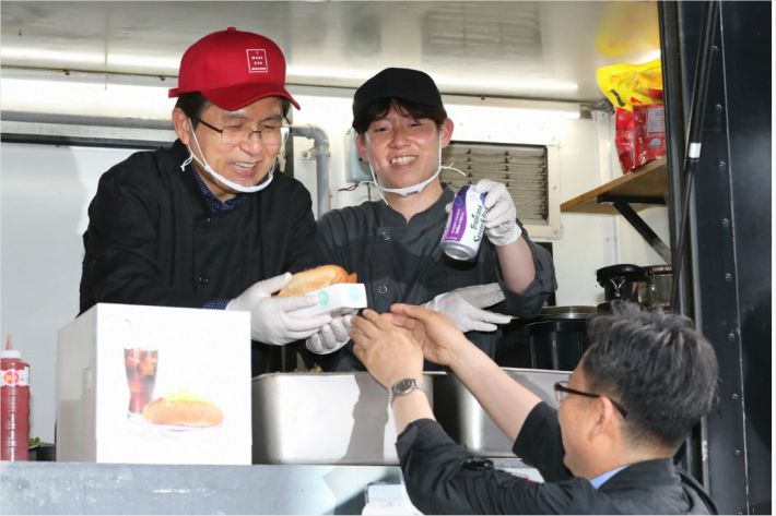 ◇청년 토크콘서트, 黃 “중도층으로 스며들어가야”황 대표는 당원과 일반인을 포함해 약 300여명이 참석한 행사에서 직접 푸드트럭에 들어가 핫도그를 만들어 판매하는 이벤트를 우선 선보였다.